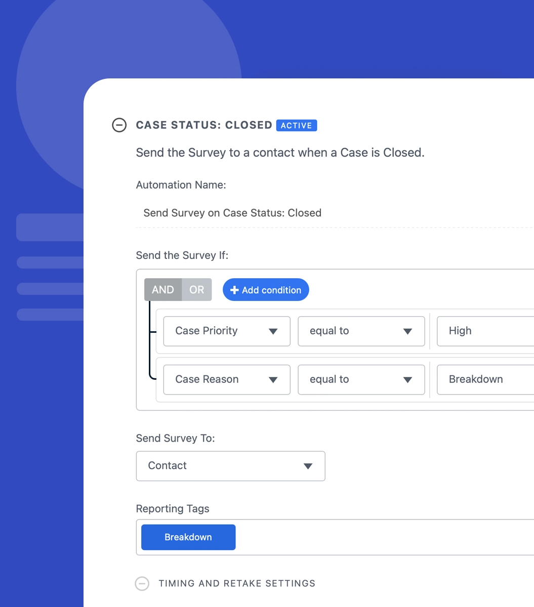 Send surveys when cases are closed, service visits end, or key statuses change.
