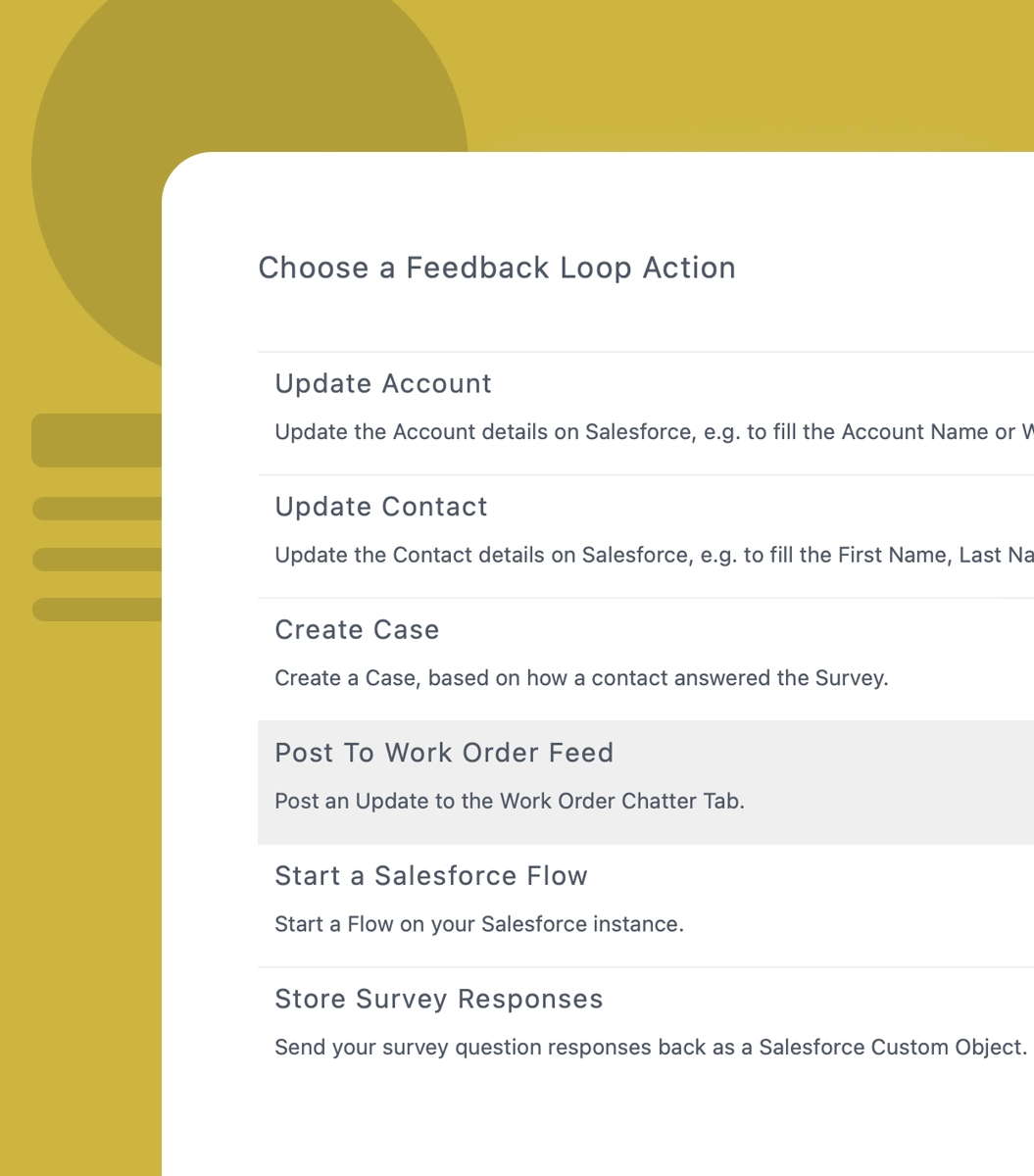 Deploy CX Cards and email surveys in just minutes. Use Salesforce Flow or Process Builder to set up automation rules and start collecting feedback instantly. Survey responses sync directly with standard or custom Salesforce objects.